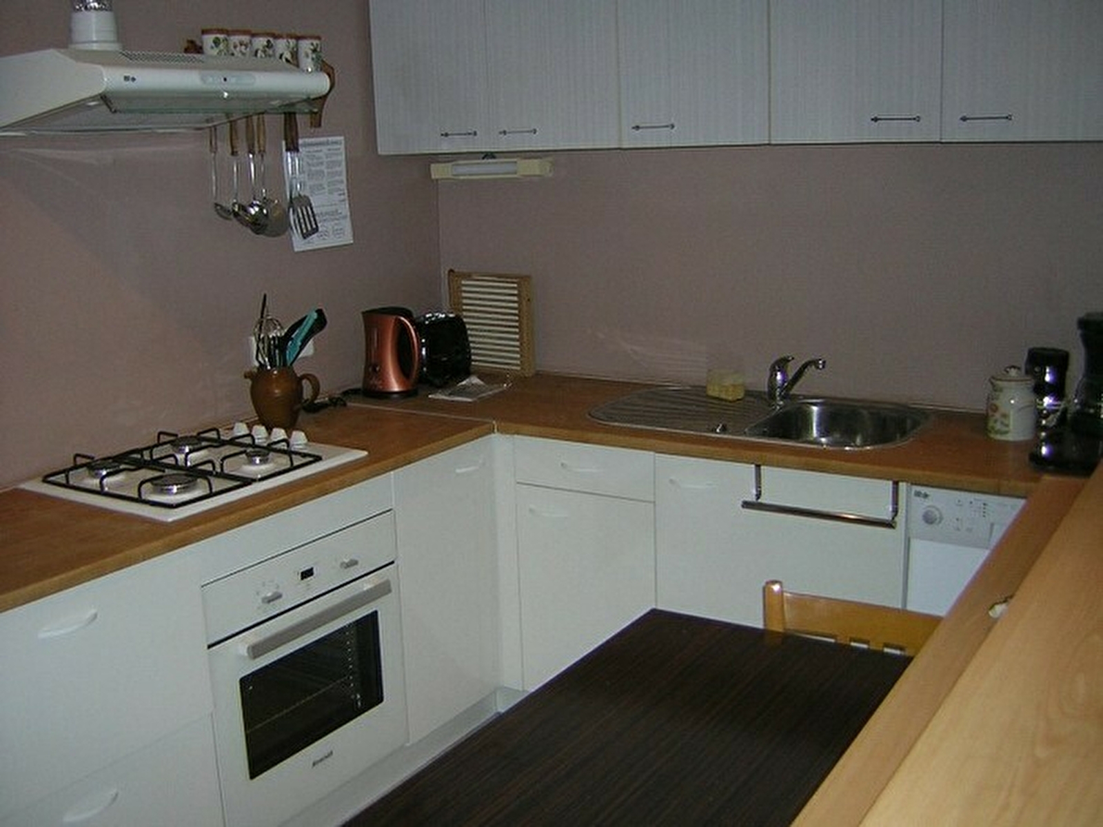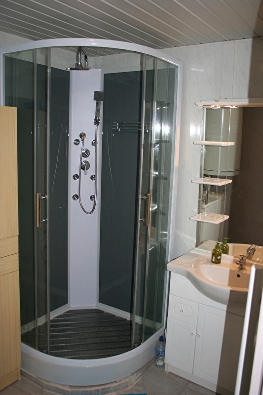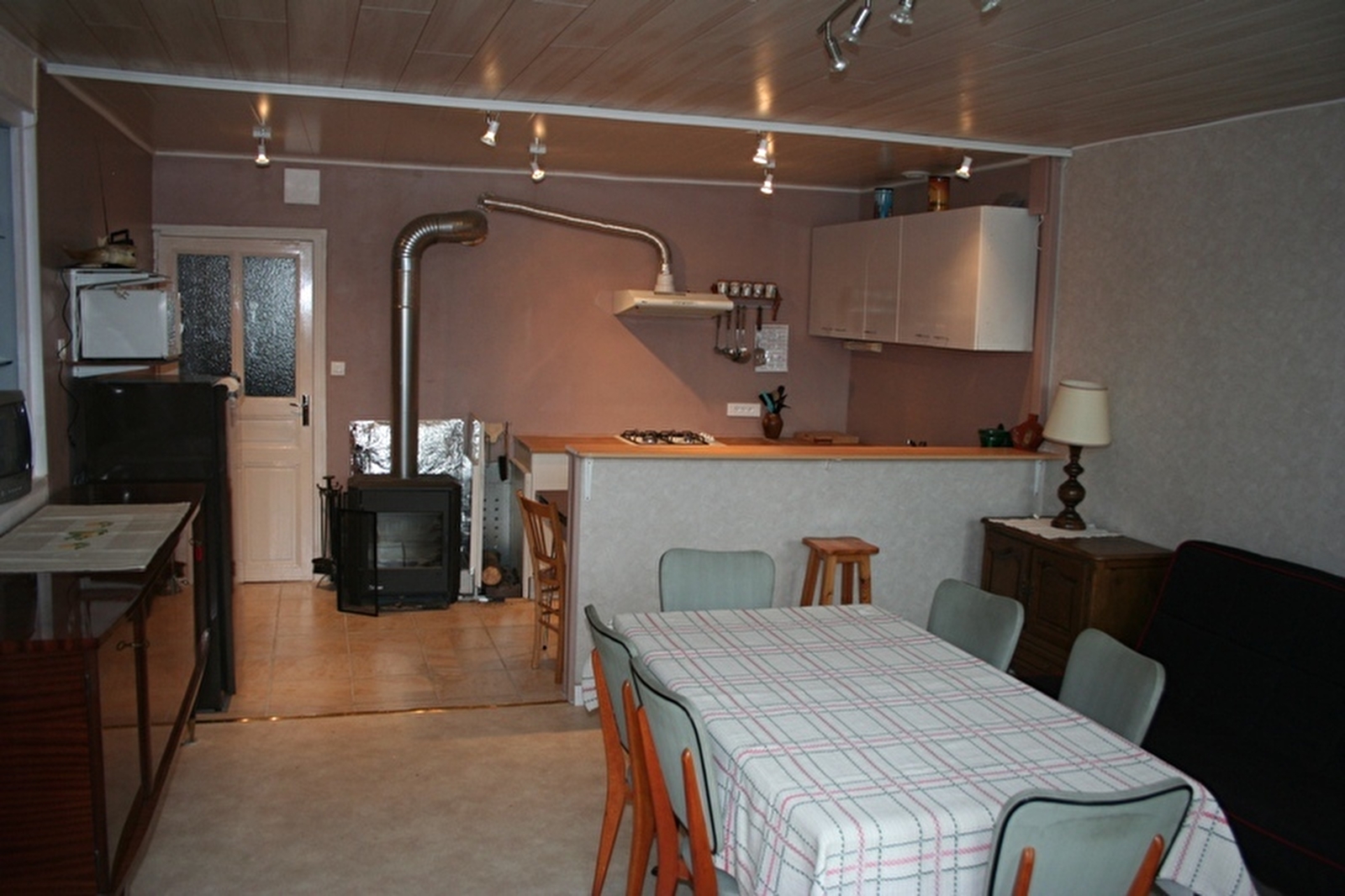 Au RDC, salle à manger, cuisine équipée (four, lave-vaisselle, micro-ondes), salle d'eau avec douche et lave-linge, WC indépendant.