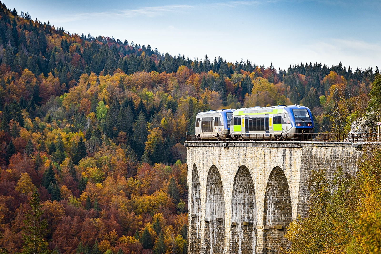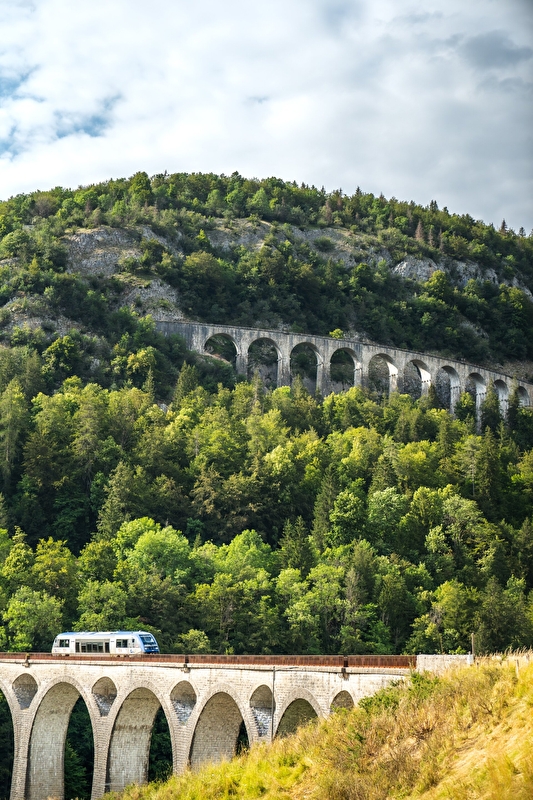 2h30 de cheminement à travers la forêt de Chaux, les réputés vignobles d'Arbois, les vastes plateaux du Grandvaux, la vallée de la Bienne.La ligne des Hirondelles dans le Jura c'est 36 tunnels dont un en forme de fer à cheval, 18 viaducs, 120 km de voyage entre ciel et terre, entre plaine et montagne, le tout entre 300 et 950m d'altitude.