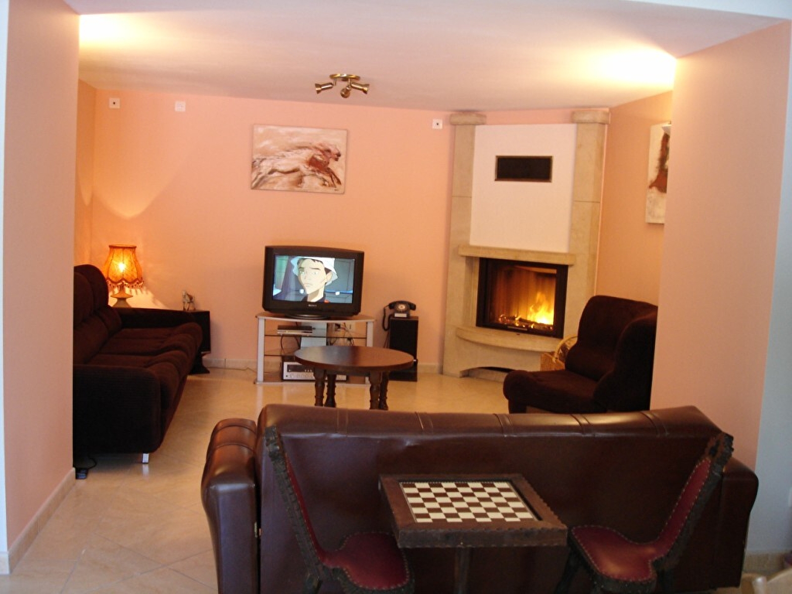 Rez de chaussée : - Cuisine équipée : plaques de cuisson électriques, lave-vaisselle, évier... - Salle à manger très spacieuse avec grande table et armoires de rangement... - Salon confortable, moderne, comprenant belle cheminée, téléviseur, lecteur DVD. - Salle de bain avec douche à l'italienne, lavabo et meuble de rangement, radiateur sèche serviettes. - WC avec lave-mains.