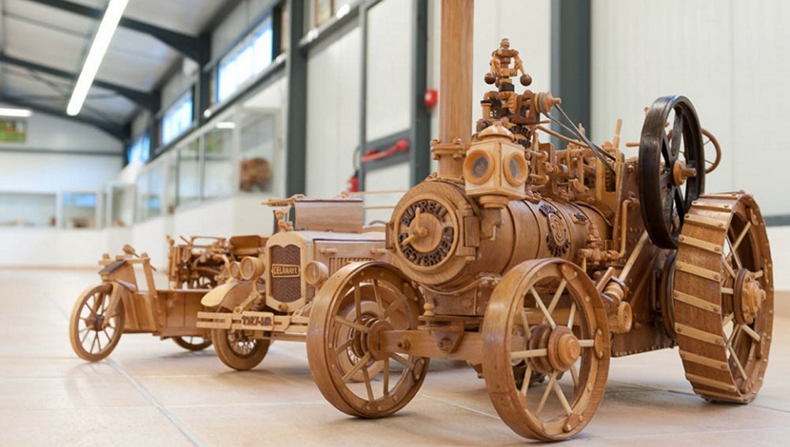 Durant toute sa vie, Marcel Yerly a réalisé, à la main, sur un établi rudimentaire, créé par ses soins une centaine de maquettes de 50 cm jusqu'à 3 mètres. Toutes les parties mécaniques, également en bois, reproduites à l'identique, fonctionnent. Voitures, machines agricoles, locomotives, bateaux, motos, avions.