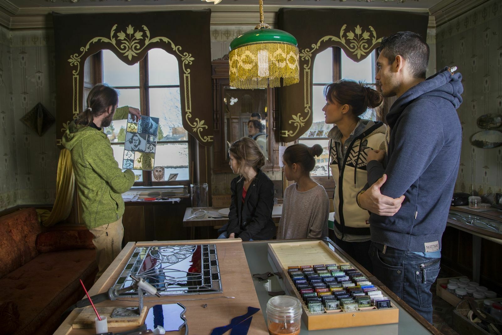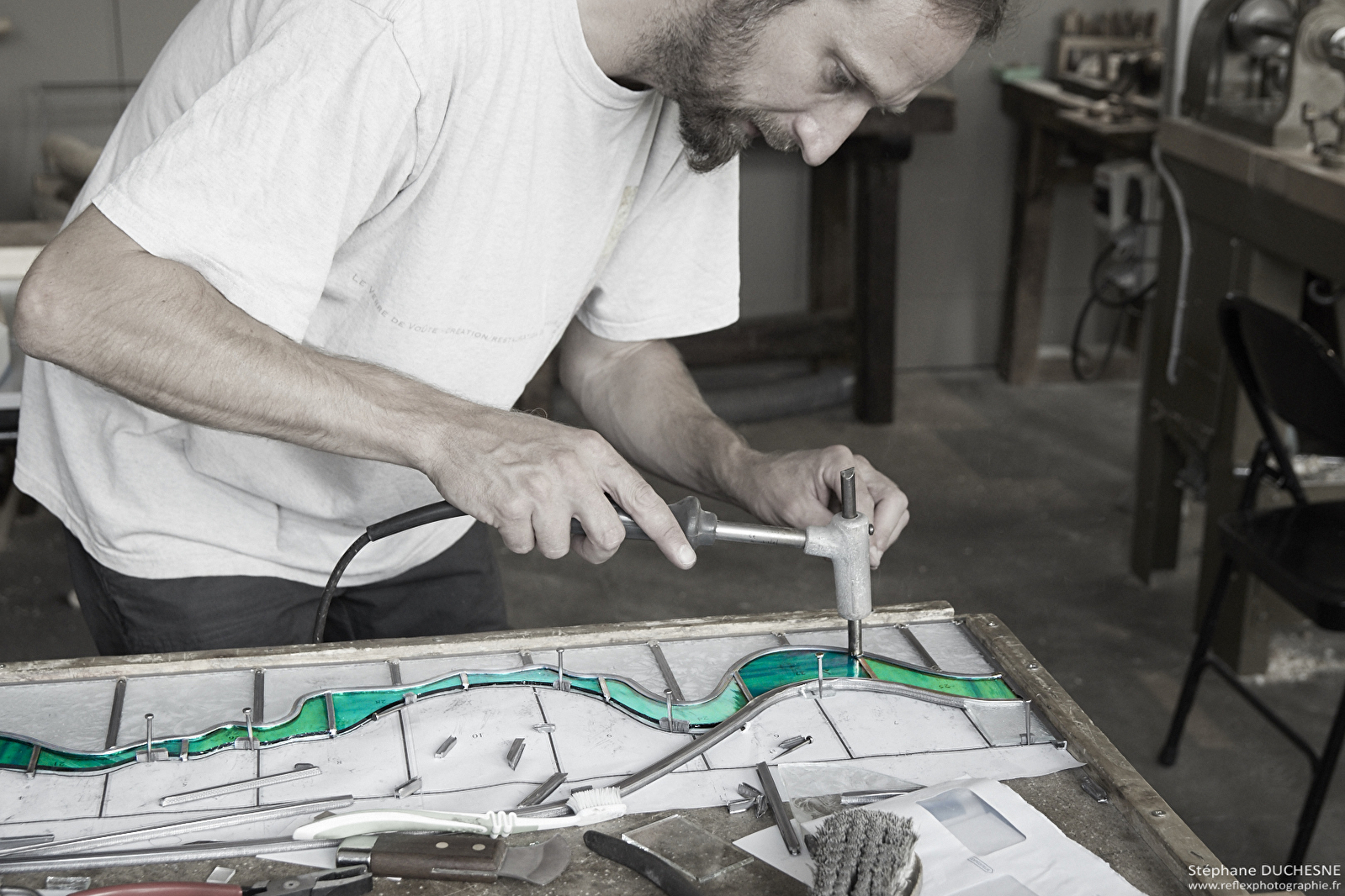 Formateur à l'atelier des Savoir-faire à Ravilloles. Différents stages proposés pendant l'année : journée découverte du vitrail, vitrail macédoine, techniques traditionnelles du vitrail, vitraux à la façon de Mondrian.